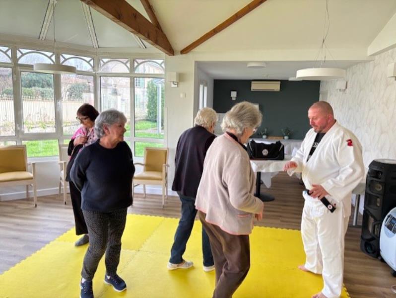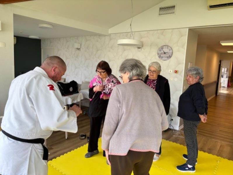 Le Jardin des Loges > Actualités > Judo avec Christophe Judo avec Christophe Publiée le 27/02/2026 Aujourd'hui, nous avons effectué un cours de judo. Les résidents ont marché sur le tapis et ont appris quelques mouvements de self-control.